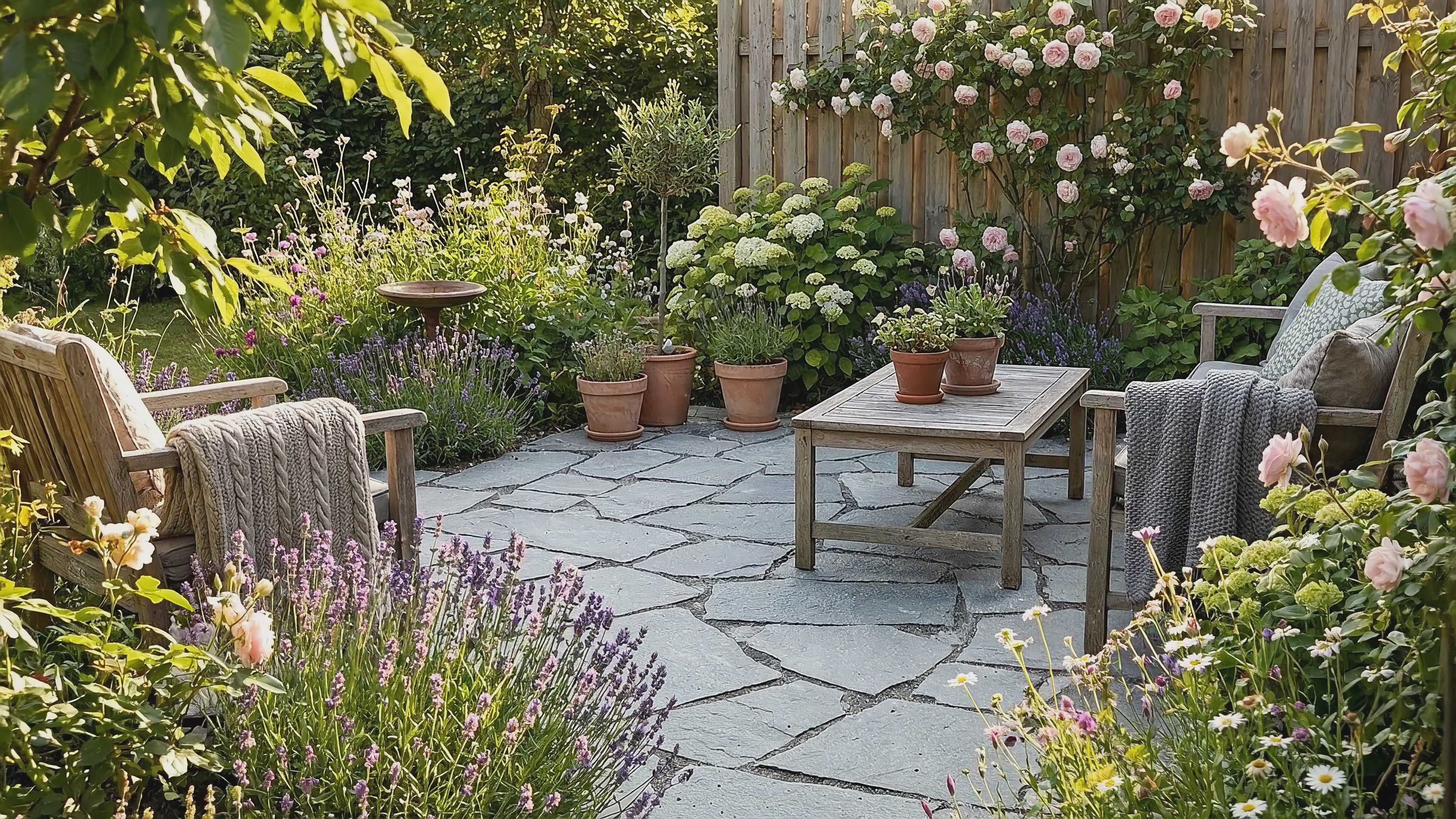 Skal stien mellem køkkenhave og orangeri være knapt så formel, skaber skiferbrud i store, uregelmæssige former et organisk flow. De flade plader hviler direkte i græsset eller i et tyndt lag afretningssand, og fordi linjerne ikke er rette, virker ruten naturlig som en skovsti. Omvendt vælger mange mahognifarvede sandstensbrud til områder med terracotta-krukker og salviebed, hvor de gyldne nuancer fanger eftermiddagslyset.