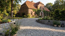 Mange af vores kunder vælger at kombinere brosten med mindre chaussesten for at skabe spændende mønstre, såsom buer eller 'påfuglehaler', indrammet af de større brosten som kant.