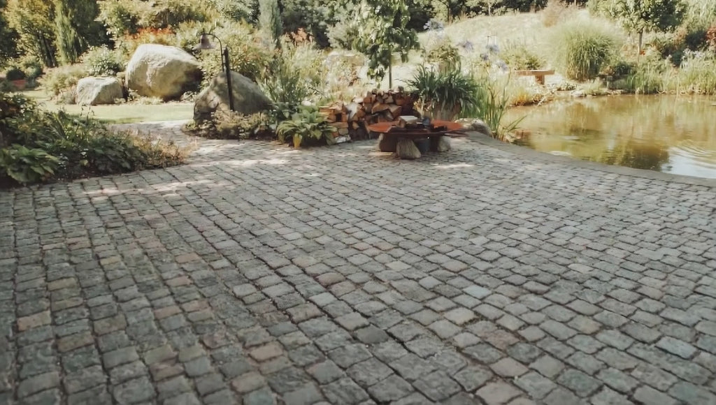 Chaussesten i en harmonisk blanding af stentyper – nye og brugte/slidte – giver et levende og tidløst udtryk til gårdsplads, indkørsel, gangstier og terrasser.