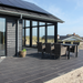 Den dybe sorte farve står utrolig flot i kontrast til grønne plæner eller lysere elementer. Mange vælger også at kombinere fliserne med sorte granitskærver langs husmuren eller i bedene for at understrege det moderne, mørke look.