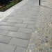 Formatet 30x45 cm er klassisk og harmonisk. Det kan lægges i forbandt (forskudte samlinger) for at øge styrken i belægningen yderligere. For et moderne og skarpt udtryk kan du med fordel afslutte belægningen mod husmuren eller haven med et bånd af sorte granitskærver, hvilket giver en smuk kontrast til den grå beton.